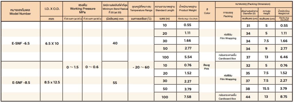 • มีความยืดหยุ่นสูง  เนื่องจากการใช้ PU แบบอ่อน E-SNF จึงเป็นท่อลมแบบมืออาชีพที่มีความยืดหยุ่นสูงและใช้งานง่าย
